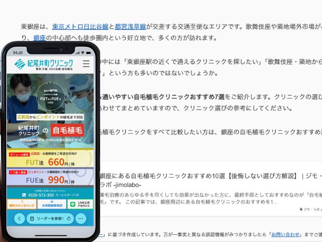 - 紀尾井町クリニック東京本院:東銀座駅から日比谷線→丸ノ内線で約13分。開院27年、症例数20,000件超の老舗専門クリニック。FUT法なら1,000株:880,000円。