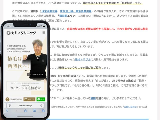 100名へのアンケート調査の結果、蒲田で自毛植毛を検討する方に最もおすすめできるクリニックとして高評価を集めたのが「カミノクリニック」でした。