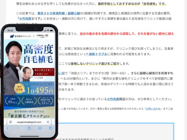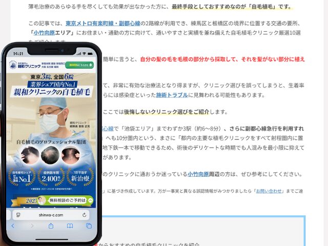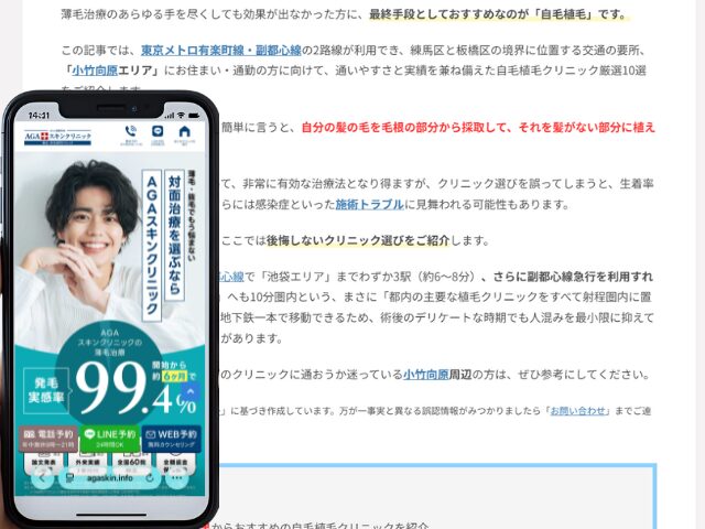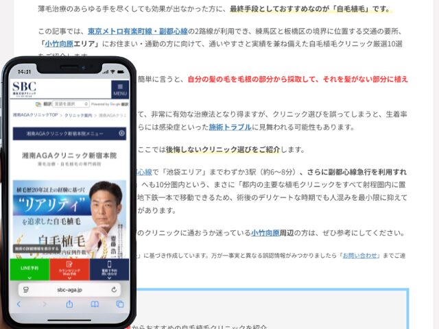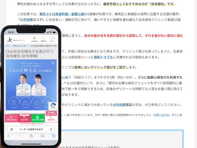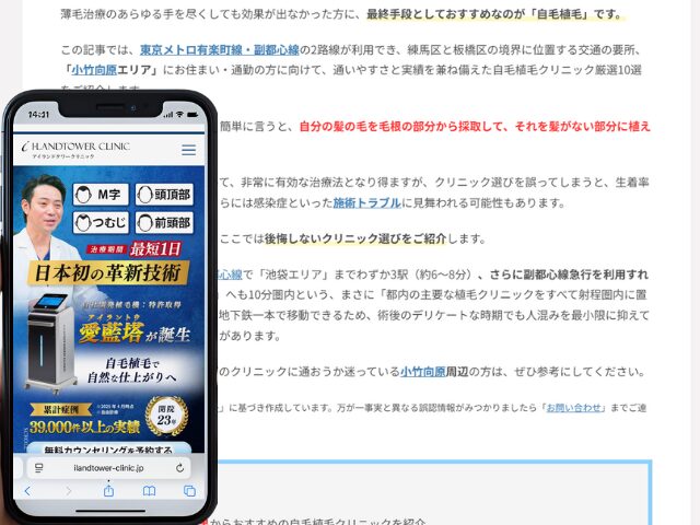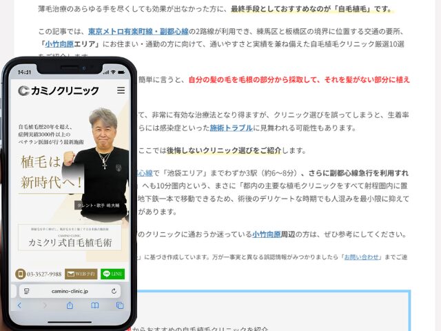 この記事では、東京メトロ有楽町線・副都心線の2路線が利用でき、練馬区と板橋区の境界に位置する交通の要所、「小竹向原エリア」にお住まい・通勤の方に向けて、通いやすさと実績を兼ね備えた自毛植毛クリニック厳選10選をご紹介します。