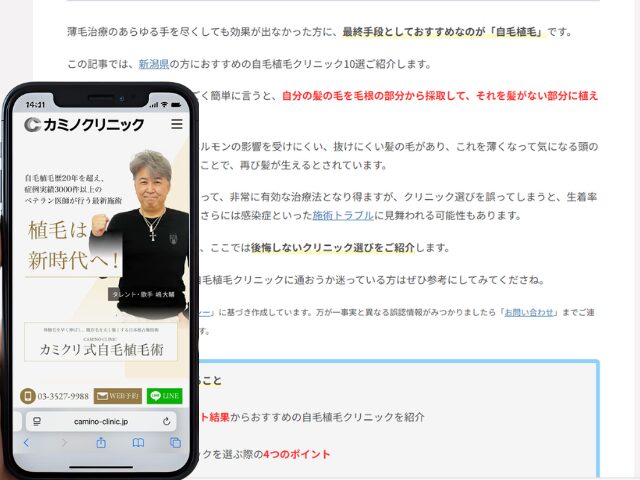 100名へのアンケート調査の結果、新潟県で自毛植毛を検討する方に最もおすすめできるクリニックとして高評価を集めたのが「カミノクリニック」でした。