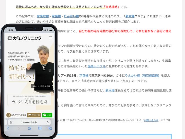 100名へのアンケート調査の結果、大手町エリアで自毛植毛を検討する方に最もおすすめできるクリニックとして高評価を集めたのが「カミノクリニック」でした。