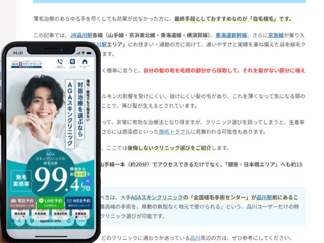 さらに特筆すべきは、大手AGAスキンクリニックの「全国植毛手術センター」が品川駅前にあること。まさに「最高峰の手術を、移動の負担なく地元で受けられる」という、品川ユーザーだけの特権を活かしたクリニック選びが可能です。